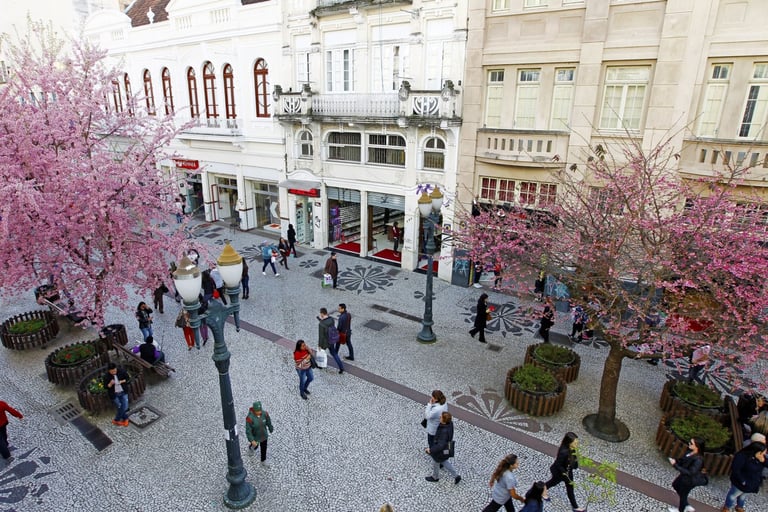 An enchanting walk on well-crafted Portuguese stone patterns through the heart of the city. This was also one of the first major pedestrian streets in Brazil.